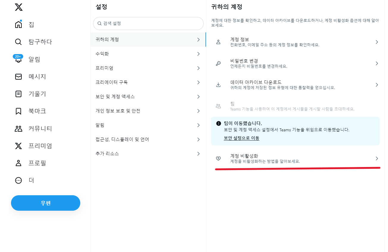그러면 설정과 계정 옵션들이 나오는데 끝에 있는 계정 비활성화를 클릭합니다.